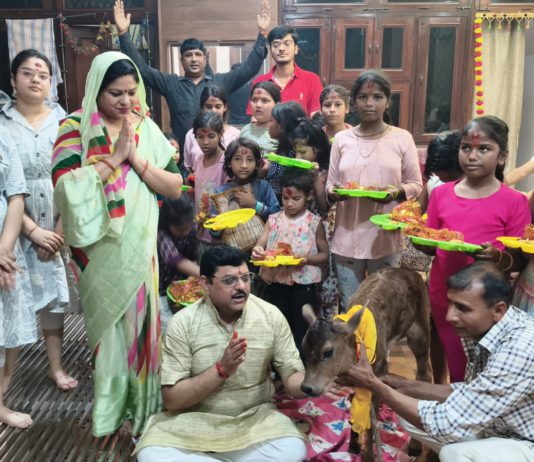 हाथरस : चैत्र नवरात्रि के पावन अवसर पर हाथरस में पूर्व पालिका अध्यक्ष पंडित आशीष शर्मा द्वारा कन्या पूजन के साथ छोटी बछिया (गौ...