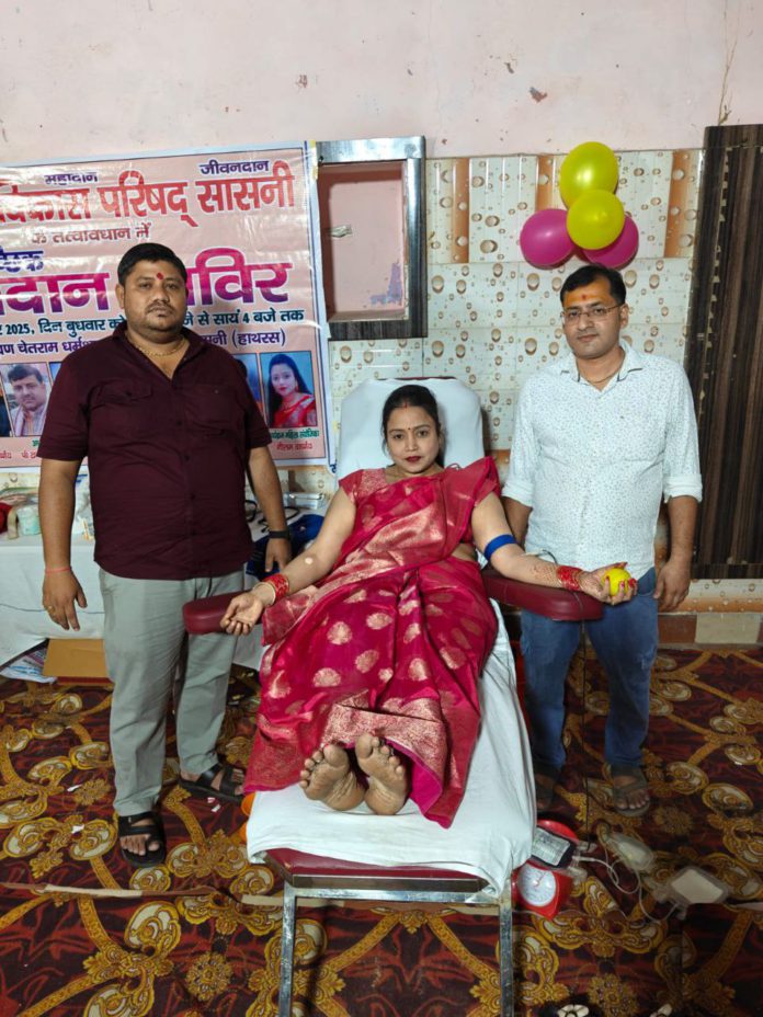सासनी : भारत विकास परिषद शाखा सासनी द्वारा चेतराम धर्मशाला में बापू ब्लड बैंक के सहयोग से विशाल स्वैच्छिक रक्तदान शिविर का आयोजन किया गया।शिविर का शुभारंभ पूर्व नगर पालिका अध्यक्ष आशीष शर्मा, वीरेंद्र कुशवाहा, मनोज शर्मा, तारा चंद्र शास्त्री, पावन भारद्वाज और डॉ. अमित ने भारत माता एवं स्वामी विवेकानंद की प्रतिमा पर माल्यार्पण और दीप प्रज्ज्वलन कर किया।कार्यक्रम के दौरान परिषद अध्यक्ष पंडित खगेंद्र शास्त्री ने कहा कि रक्तदान महादान है, और जब जरूरत के समय रक्त नहीं मिलता, तब इसकी असली कीमत समझ में आती है। उन्होंने कहा कि किसी के जीवन को बचाना सबसे बड़ा पुण्य कार्य है।परिषद के सचिव ज्ञानेंद्र कुशवाहा ने बताया कि भारत विकास परिषद हर वर्ष जनसेवा के कार्यक्रम आयोजित करती है। इस वर्ष शिविर में करीब 98 यूनिट रक्तदान किया गया।शिविर में पंडित खगेंद्र शास्त्री, ज्ञानेंद्र कुशवाहा, नवीन वार्ष्णेय, नरेश वार्ष्णेय, डॉ. विकास सिंह, अंबुज जैन, हिमांशु वार्ष्णेय, महेंद्र सिंह, कालू पंडित, लालता प्रसाद माहौर, नीलम वार्ष्णेय, रामस्वरूप कुशवाहा, शिव कुमार, लक्ष्मण प्रसाद, डॉ. अमित कुशवाहा, डॉ. मनीष कुशवाहा, कुलदीप कुमार, दलवीर सिंह, अर्जुन, विकास, शैलेन्द्र कुमार सिंह, अंजली और मुकेश सहित कई लोग मौजूद रहे।