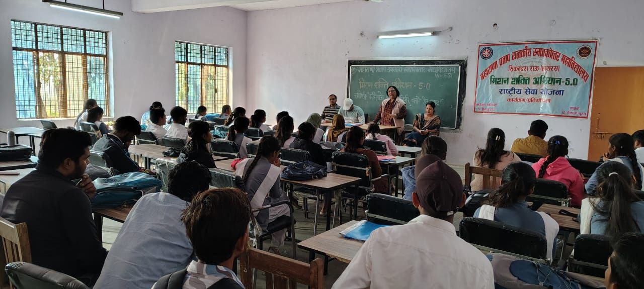 सिकंदराराऊ : महाराणा प्रताप राजकीय स्नातकोत्तर महाविद्यालय में मिशन शक्ति अभियान 5.0 के आयोजन के क्रम में महाविद्यालय की आदरणीय प्राचार्या प्रो. शैफाली सुमन के कुशल दिशा-निर्देशन एवं मार्गदर्शन में मिशन शक्ति प्रभारी विश्वनाथ प्रताप सिंह ने ‘महिलाओं में आत्मनिर्भरता को बढ़ाने वाले उपाय’ विषय पर संगोष्ठी का आयोजन कराया, जिसमें मुख्य वक्ता के रूप में प्रो. मंजू उपाध्याय जी का मार्गदर्शन प्राप्त हुआ।