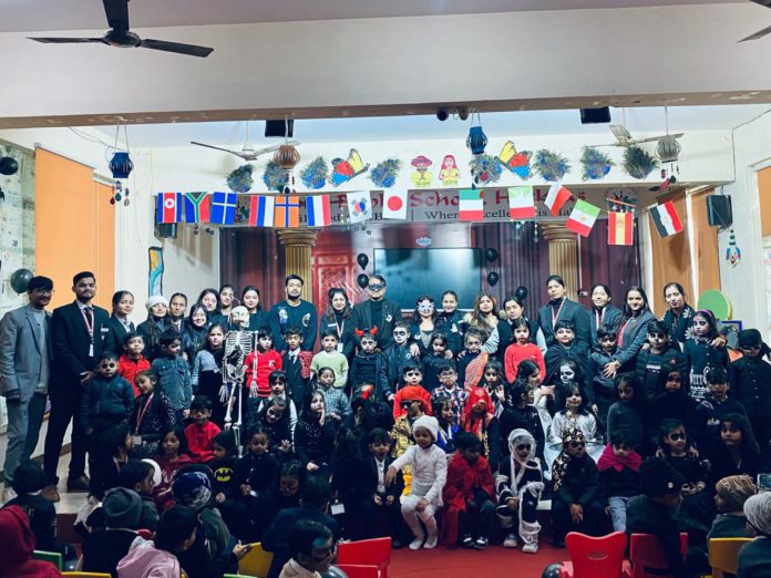 हेलोवीन पार्टी का आयोजन फाउंडेशन कोऑर्डिनेटर नम्रता अग्रवाल के कुशल निर्देशन में किया गया। कार्यक्रम के दौरान विद्यालय का सभागार बच्चों की कल्पनाशील वेशभूषाओं और साज-सज्जा से भय और आनंद का अनोखा संगम प्रस्तुत कर रहा था। छात्र-छात्राएँ भूत, राक्षस एवं डरावने पात्रों की वेशभूषा में काले और सफेद रंग के वस्त्रों से सुसज्जित होकर, विभिन्न प्रकार के मास्क, डरावने प्रॉप्स, नकली खून, त्रिशूल लगे शरीर एवं विशेष मेकअप के साथ मंच पर उपस्थित हुए, जिसने सभी को आकर्षित कर लिया।कार्यक्रम की मुख्य झलकियों में नन्हे-मुन्ने बच्चों द्वारा प्रस्तुत दो मनमोहक नृत्य एवं एक प्रभावशाली नाटिका शामिल रही। नाटिका में बच्चों ने अपने जीवंत अभिनय से दर्शकों को मंत्रमुग्ध कर दिया। विशेष रूप से अदिति सिंह ने मंजुलिका का किरदार निभाकर सभी को चकित कर दिया। नाटिका के माध्यम से यह संदेश दिया गया कि जीवन में हर परिस्थिति में संतुलन बनाए रखना अत्यंत आवश्यक है—चाहे वह जीवन से पहले हो या मृत्यु के बाद का संघर्ष।