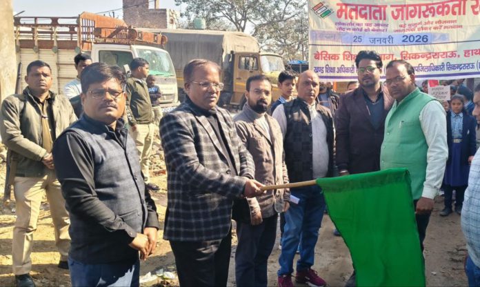 सिकंदराराऊ : राष्ट्रीय मतदाता दिवस के मौके पर लोगों को मतदान के प्रति जागरूक करने के उद्देशय से नगर के पुरानी तहसील स्थित जूनियर हाई स्कूल से मतदाता जागरूकता रैली निकाली गई। रैली का शुभारंभ एसडीएम संजय कुमार एवं खंड शिक्षा अधिकारी विजय चौहान तथा तहसीलदार सोनू बघेल द्वारा संयुक्त रूप से फीता काटकर एवं हरी झंडी दिखाकर किया गया। मतदाता जागरूकता रैली के संयोजक खंड शिक्षा अधिकारी विजय चौहान थे। रैली में शिशु शिक्षा मंदिर पेड़ वाला स्कूल, जेपीएस इंटर कॉलेज एवं राजकमल पब्लिक स्कूल आदि स्कूलों के छात्र छात्राओं ने भाग लिया।