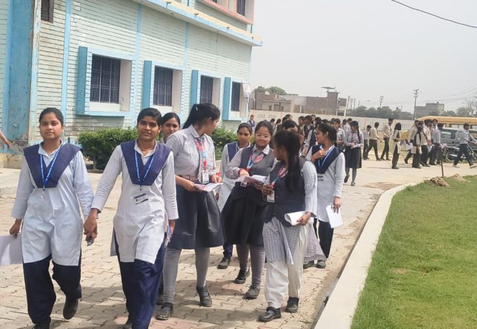 हाथरस के हसायन स्थित ओएमबी इंटरनेशनल स्कूल में सीबीएसई की कक्षा 12वीं की अंग्रेजी की परीक्षा के बाद छात्र-छात्राएं स्कूल से बाहर निकलते दिखाई दिए। परीक्षा समाप्त होने के बाद विद्यार्थियों के चेहरे पर राहत और खुशी देखी गई।