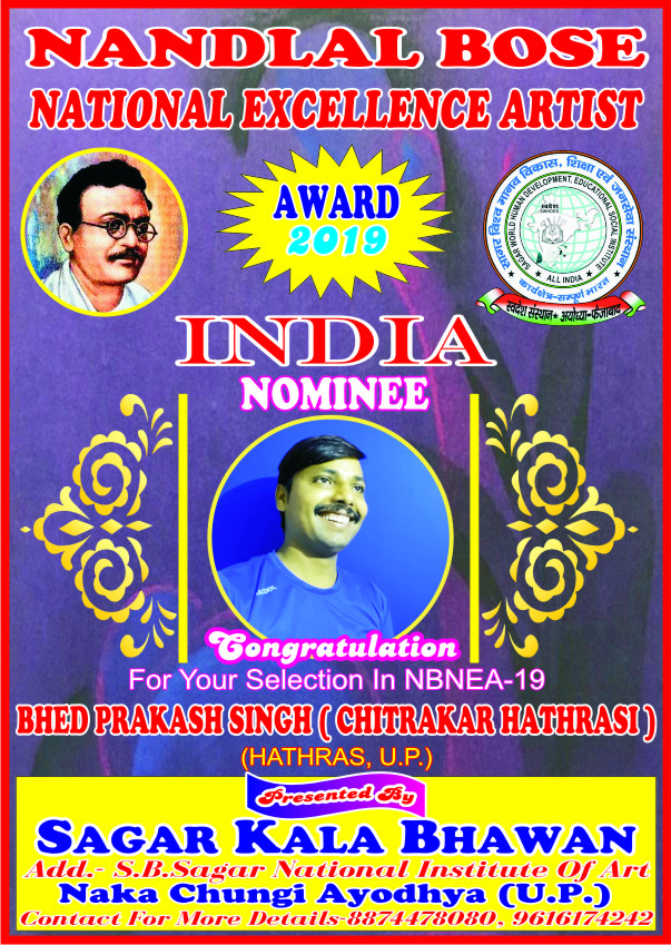 प्रथम पदम विभूषण पुरूस्कार विजेता श्री नन्द लाल बोस जयन्ती पर “सागर कला भवन ” अयोध्या द्वारा 3 सितम्बर 2019 को आयोजित “राष्ट्रीय श्रेष्ठ कलाकार सम्मान 2019 ” से हाथरस जनपद के प्रख्यात चित्रकार भेद प्रकाश सिंह हाथरसी उ0 प्र0 को चयनित किया गया है ।यह पुरूस्कार कलाकारों द्वारा कला के क्षेत्र में किये गये उनके उत्कृष्ट कार्यों /अमूल्य योगदानों के लिये प्रदान किया जाता है ।