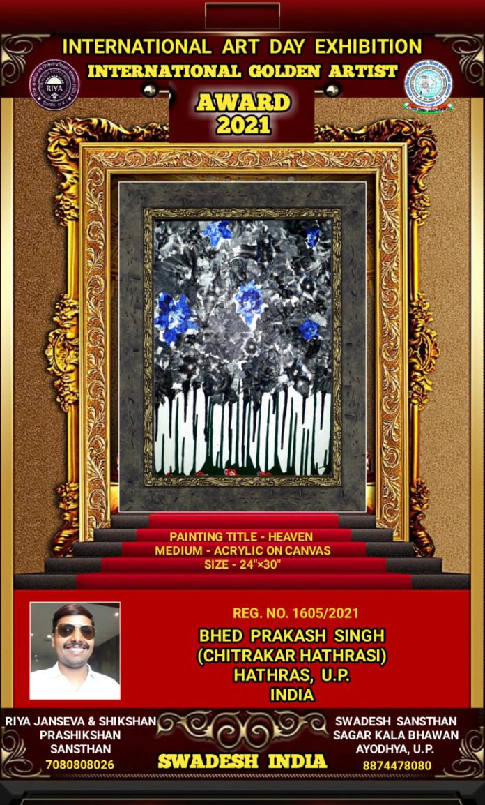 हाथरस जनपद : कला जगत में चित्रकार हाथरसी के नाम से मशहूर चित्रकार भेद प्रकाश सिंह को उनकी पेंटिंग हैवेन को स्वदेश संस्थान भारत द्वारा आयोजित इंटरनेशनल आर्ट डे एक्सहिबिशन के अंतर्गत इंटरनेशनल गोल्डन आर्टिस्ट अवार्ड 2021 पुरुस्कार से नवाजा गया।