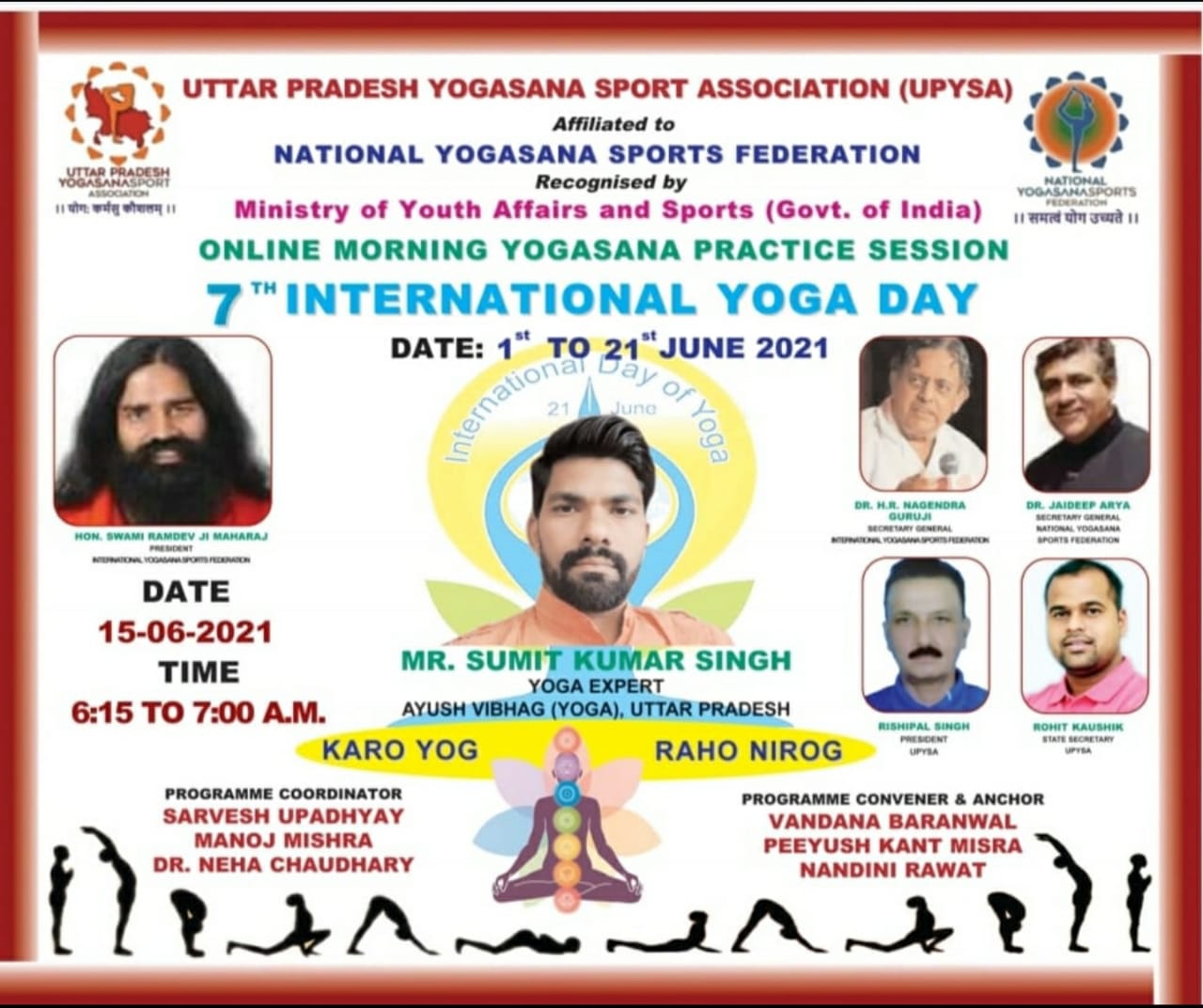 हाथरस : नेशनल योगासन स्पोर्ट्स फेडरेशन की राज्य इकाई उत्तर प्रदेश योगासन स्पोर्ट्स एसोसिएशन के बैनर तले सातवें अन्तराष्ट्रीय योग दिवस के अवसर पर 21 दिवसीय राष्ट्रीय योग प्रशिक्षण कार्यक्रम का आयोजन ऑनलाइन किया जा रहा है।गौरतलब है नेशनल योगासन स्पोर्ट्स फेडरेशन खेल मंत्रालय,भारत सरकार से मान्यता प्राप्त है।कार्यक्रम में आज मुख्य योग विशेषज्ञ और प्रशिक्षक के तौर पर योग वेलनेस सेंटर सासनी में कार्यरत योगाचार्य सुमित कुमार सिंह को आमंत्रित किया गया।कार्यशाला में योगाचार्य द्वारा 21 जून को होने वाले कार्यक्रम के लिए प्रशिक्षणार्थियों को कॉमन योगा प्रोटोकॉल का अभ्यास कराया गया।साथ ही प्रशिक्षुओं के योग से संबंधित शंकाओं तथा त्रुटियों का समाधान योगाचार्य सुमित कुमार सिंह द्वारा किया गया।देशभर से सैकड़ों योग प्रेमियों ने प्रशिक्षण सत्र में सक्रिय सहभागिता की।UPYSA की राज्य इकाई द्वारा योगाचार्य सुमित कुमार सिंह का धन्यवाद ज्ञापित किया गया।
