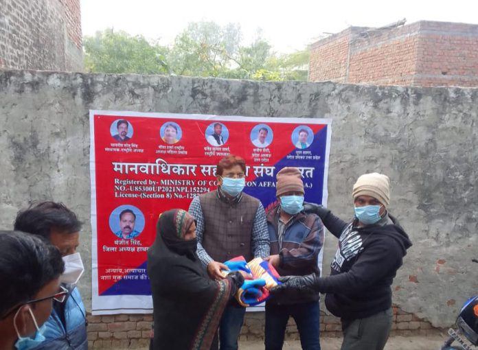 हाथरस : हाथरस के चावड गेट चौराहे पर मानवाधिकार सहायता संघ के पदाधिकारियों ने मकर संक्रांति के पर्व पर खिचड़ी भोग का आयोजन किया और राह में आने जाने वालों को खिचड़ी बांटकर प्रेम भाईचारे का सन्देश दिया साथ ही कोरोना को ध्यान में रखते हुए मास्क वितरण भी किये । उधर खोड़ाहजारी में पूरन सागर प्रवक्ता उत्तर प्रदेश की मौजूदगी में गरीब बेसहारा लोगों को कम्बल, मूंगफली एवं गजक वितरित कर उनको संघ के उद्देश्यों से अवगत कराया गया। प्रवक्ता ने बताया कि मानवाधिकार सहायता संघ पूरे भारत वर्ष में निःस्वार्थ भाव से समाज एवं राष्ट्र हित में अपना योगदान दे रहा है जिसमें भ्रष्टाचार, घूसखोरी, दहेज हत्या, नशा, बाल मजदूरी, बलात्कार आदि के खिलाफ आवाज उठाकर न्याय एवं शांति की ओर कदम बढ़ाया जा रहा है। मानवाधिकार सहायता संघ हाथरस की टीम में पूरन सागर प्रवक्ता उत्तर प्रदेश,मंजीत सिंह जिला अध्यक्ष, वीनेश कुमार प्रमुख अलीगढ मण्डल, देवेंद्र ठाकुर जिला प्रभारी, हरिओम शर्मा जिला प्रमुख, अशोक कुमार जिला सह प्रभारी, आर एस अग्निहोत्री जिला प्रवक्ता, डॉ. महाराज सिंह जिला चेयरमैन, विकाश कुमार जिला योजना मंत्री, डॉ. सतीश चन्द्र जिला प्रचारक, बलबीर सिंह जिला महासचिव,गौरव वर्मा नगर सचिव,सचिन अग्निहोत्री जिला सहायक, संजय कौशिक जिला सहायक,राजेश कुमार सदस्य एवं अन्य पदाधिकारी मौजूद रहे।