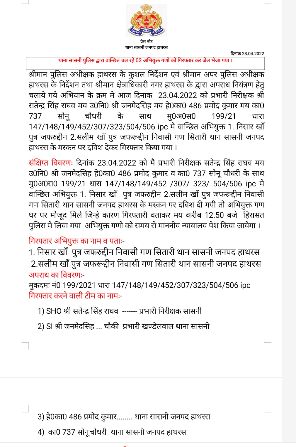 सासनी पुलिस अधीक्षक हाथरस विकास कुमार बैध एवं अपर पुलिस अधीक्षक एवं क्षेत्राधिकारी के निर्देशन में चलाये जा रहे अपराधियों की धड़ पकड़ एवं अपराध नियंत्रण के क्रम में शुक्रवार को सासनी कोतवाली पुलिस प्रभारी सतेन्द्र सिंह राघव एवं खंडेलवाल चौकी प्रभारी जन्मेद सिंह हैड कांशटेबिल प्रमोद कुमार, सोनू चौधरी ने उनके निवास दबिस दी तो दो नामजद को घर से धर दबोचा अपराध संख्या 199/21धारा 147/148/149/452/307/323/504/506/आई पी की धाराओं में वांछित चल रहे अपराधी 1= निसार खां पुत्र जफुरुद्दीन2=सलीम खां पुत्र जफरउद्दीन निवासी सिताहरी थाना सासनीको धर दबोचा और पुलिस ने गिरफ्तार कर माननीय न्यायालय के समक्ष पेश कर भेजा जेल।