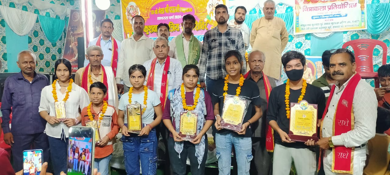 हाथरस : दिनांक 11 सितम्बर मेला श्री दाऊ महाराज के प्रांगण में श्री कुशवाहा क्षत्रिय संघ हाथरस द्वारा संचालित शिविर में बड़े ही धूमधाम से संपन्न हुआ कार्यक्रम संयोजक गोकुलचंद कुशवाहा, प्रकाशन, केला देवी प्रकाशन अहियापुर खुर्द हाथरस, कार्यक्रम की अध्यक्षता शंकरलाल कुशवाहा,उद्घाटन किशन गोपाल कुशवाहा सभासद व ,हरि किशन कुशवाहा हंस कला ने की मुख्य अतिथि के रूप में ठा. वीर बहादुर कुशवाहा, निर्णायक मंडल, चित्रकला थान सिंह कुशवाहा कमल आर्ट, विशिष्ट अतिथि महिपाल सिंह कुशवाहा बीएसएनएल, शिविर मै प्रतियोगिता सीनियर और जूनियर वर्ग की प्रतियोगिता आयोजित की गई चित्रकला प्रतियोगिता में सीनियर वर्ग में प्रथम स्थान रितिक कुशवाहा द्वितीय स्थान अनोखी कुशवाहा और तृतीय स्थान अंजलि कुशवाहा और जूनियर वर्ग में प्रथम स्थान पूजा कुशवाहा रही कार्यक्रम को संबोधित ठाकुर वीर बहादुर सिंह कुशवाहा, थान सिंह कुशवाहा कमल गोकुल चंद कुशवाहा ने कहा जिन बच्चों को आज प्रथम द्वितीय तृतीय व सान्त्वना पुरस्कार प्राप्त किया है उन्हें हम बहुत बहुत बधाई और शुभकामनाएं देते हुए प्यारे बच्चों को जिन्हें सान्त्वना पुरस्कार मिला है आने वाले समय में आप भी प्रथम स्थान प्राप्त कर सकते हैं सिर्फ जरूरत है कठिन परिश्रम की यह कला निरंतर प्रयास चलता रहे और जोश न ठंडा होने पाए कदम से कदम मिलाकर चल मंजिल पर तेरे पग चूमेगी आज नहीं तो कल मंजिल मिलेगी कार्यक्रम संयोजक गोकुल चंद कुशवाहा ने सभी प्रतियोगियों को सान्त्वना पुरस्कार व जलपान आदि के साथ विदा किया कार्यक्रम का सफल संचालन शेखर कुशवाहा ने किया कार्यक्रम को सफल बनाने में अध्यक्ष टेकपाल कुशवाहा ,मीडिया प्रभारी देवानंद कुशवाहा,सोशल मीडिया मनीष कुशवाहा,प्रचार मंत्री जितेंद्र उर्फ टम्पा कुशवाहा,गौरव रघुवंशी, घूरेलाल कुशवाह, विजय सिंह कुशवाहा, सोनू कुशवाहा,संजय कुशवाहा, नितिन कुशवाहा, चाहत कुमार कुशवाहा, आदि रहे ।