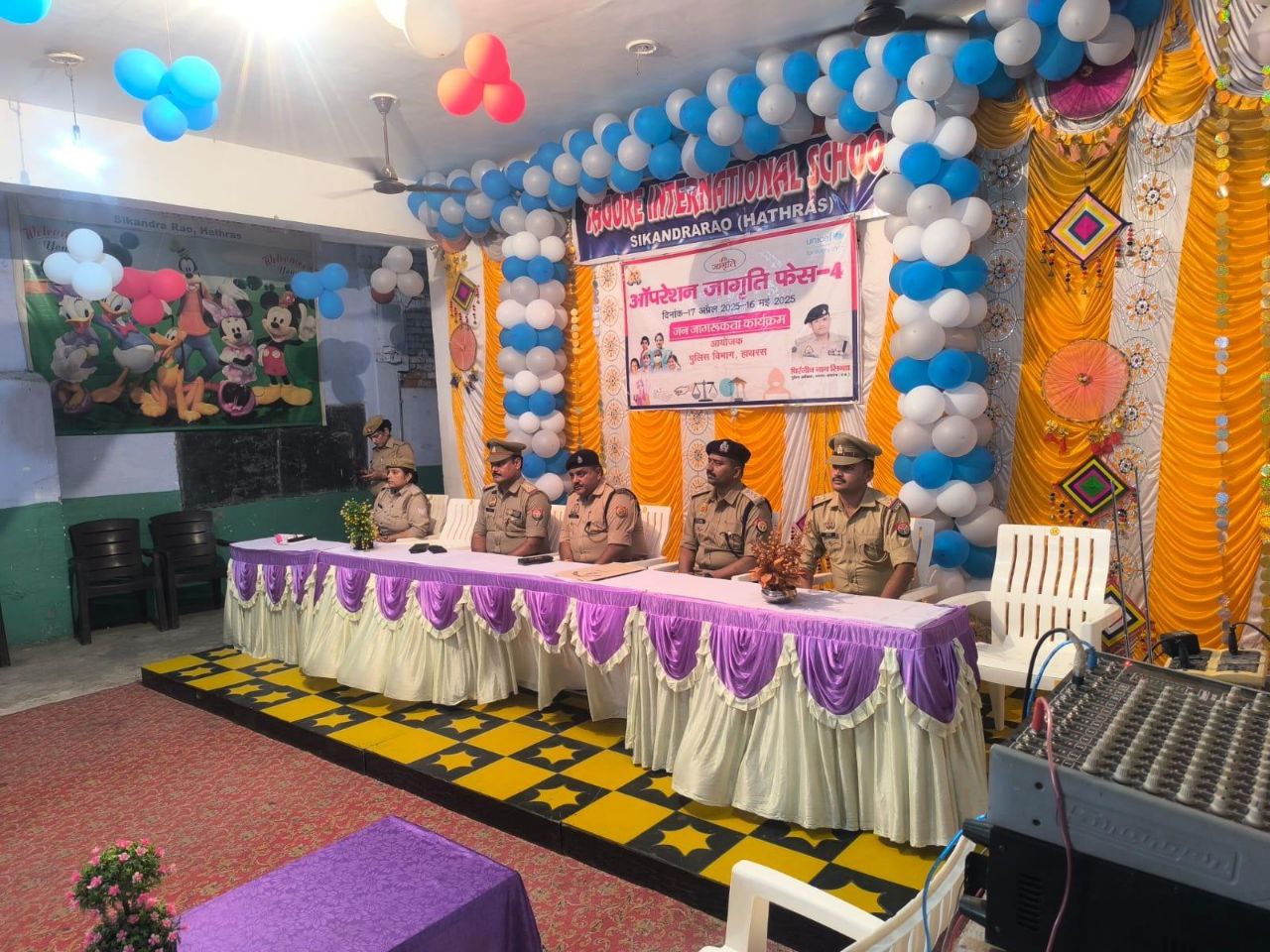 सिकंदराराऊ। पुलिस अधीक्षक हाथरस के निर्देशन में जनपद में चलाये जा रहे अभियान “ऑपरेशन जागृति फेज़-04” के तहत अपर पुलिस अधीक्षक अशोक कुमार द्वारा टैगोर इण्टरनेशनल स्कूल सिकन्द्राराऊ में कार्यक्रम आयोजित कर उपस्थित महिलाओं , बालिकाओं व आमजन को ऑपरेशन जागृति के उद्देश्यो के बारे में जानकारी देते हुये सुरक्षा सम्बंधी उपायों, विभिन्न हेल्पलाइन नम्बरों, संचालित कल्याणकारी योजनाओं व साइबर अपराधो से बचाव हेतु जागरुक किया गया और अभियान का जन-जन तक प्रचार प्रसार करने की अपील की गई । इस दौरान क्षेत्राधिकारी जेएन अस्थाना, प्रभारी निरीक्षक विजय कुमार , प्रभारी निरीक्षक महिला शिकायत प्रकोष्ठ, यूनिसेफ के पदाधिकारी एवं आसपास के गांव से आये महिला, बालिकाएं व जनसामान्य उपस्थित रहे ।