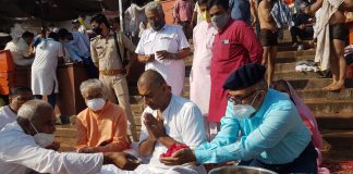अस्थियां विसर्जित करने से पूर्व पूजा पाठ करते उनके पुत्र तथा...
