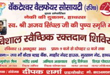 हाथरस : 12 अक्टूबर 2025। सामाजिक सरोकारों को समर्पित संस्था “नेकी की दुकान (VWS)” द्वारा स्वर्गीय श्री अजय सिंघल जी की पुण्य स्मृति में...