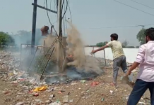 हाथरस चंदपा क्षेत्र के गांव मीतई मैं ट्रासफार्मर की मैन केबिल मैं लगी आग