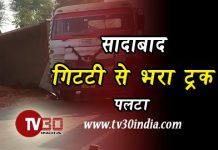 हाथरस : सादाबाद आगरा राष्ट्रीय राजमार्ग पर गिट्टी से भरा ट्रक असंतुलित होकर पलट...
